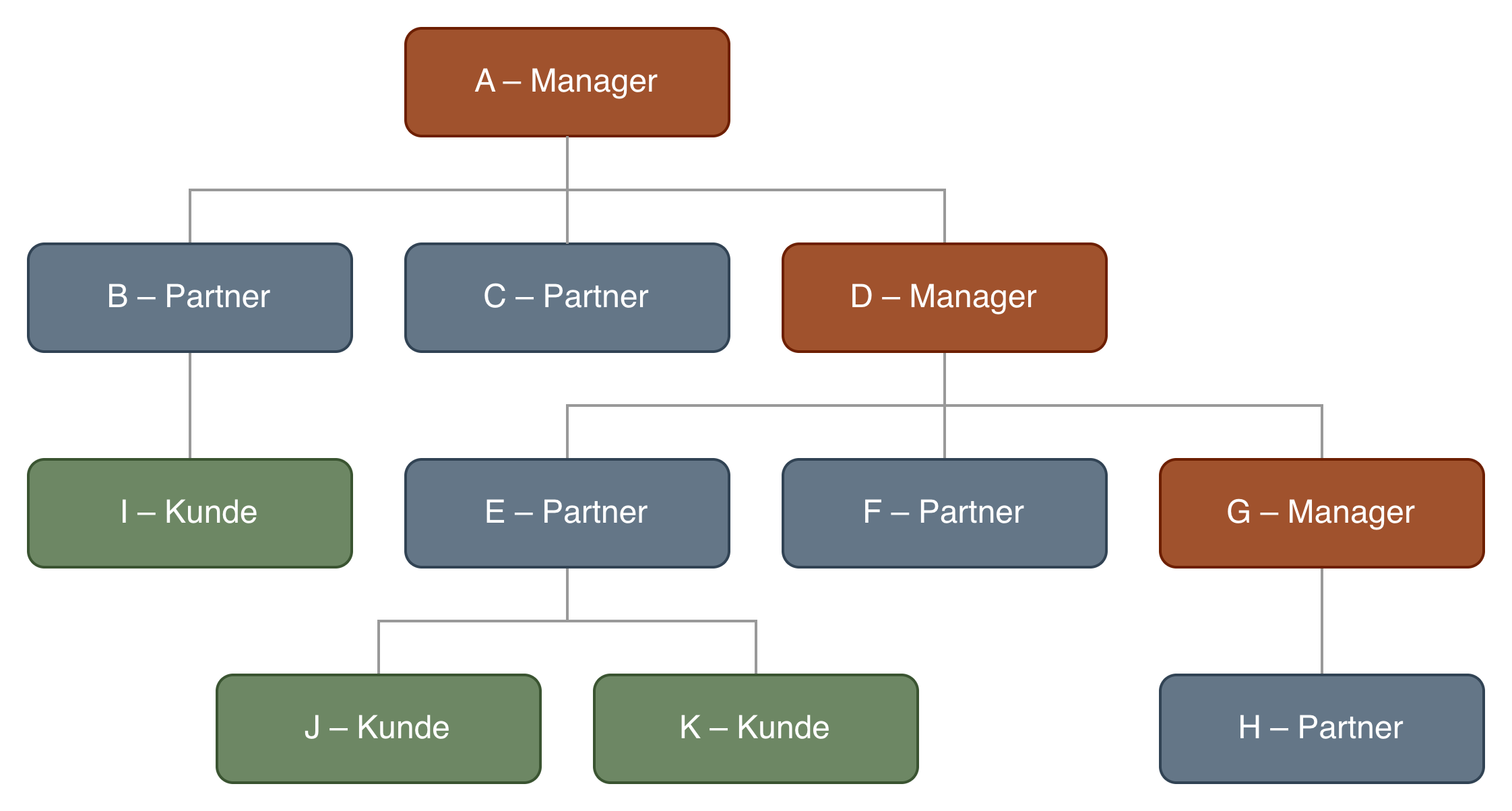 • das offene Volumen von Manager D ist der Umsatz von E, F, J und K